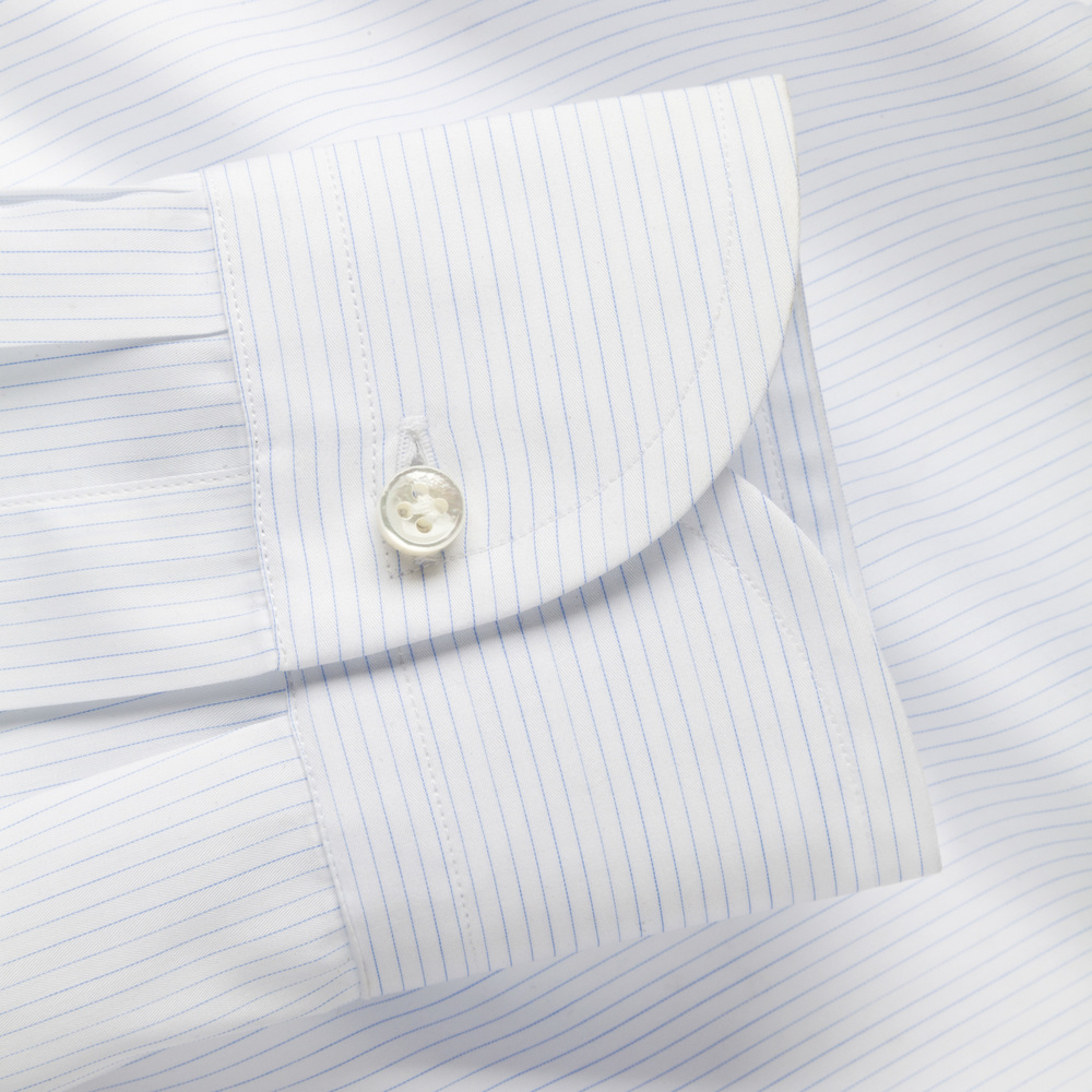 Koszula biała w drobne błękitne paski została uszyta z najwyższej jakości egipskiej bawełny o podwójnym splocie marki Tessitura Monti.
